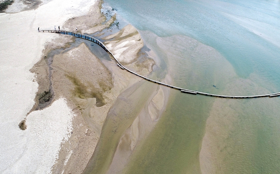 경북 영주 무섬마을을 찾은 사람들이 7월11일 겨우 명맥을 지키고 있는 모래밭을 지나 외나무다리를 걷고 있다. 영주댐이 강물을 막은 뒤 고운 모래가 아름답던 무섬마을 앞 모래밭에는 풀이 자라기 시작했다. 트랙터로 모래를 뒤엎어 매년 풀을 없애고, 쓸려나간 모래는 보충해주어야 한다. 더는 모래가 흐르지 않자 내성천 강바닥에 잔돌이 쌓이고 있다. 물이 잘 흐르지 않는 곳은 풀과 나무가 무성하다.
