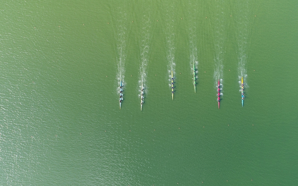 사상 최악의 폭염 속 녹조가 생겨 강물이 진한 풀색으로 물든 충남 부여군 금강에서 7월31일 오후 백마강배 전국카누경기대회가 열렸다. 대회에 출전한 선수들이 앞다투어 노를 젓고 있다. 수문이 닫힌 백제보 하류 경기장은 강물 속에 녹조 알갱이가 떠다니고 있다. 강 가장자리는 밀려든 녹조 때문에 모래와 자갈이 풀색으로 물든 상태다. 수문을 연 세종보와 공주보 주변은 조류 농도가 줄어들고 모래톱이 새로 생겨 강이 제 모습을 찾고 있지만, 수문을 닫은 백제보 주변은 올해도 녹조가 생겼다.