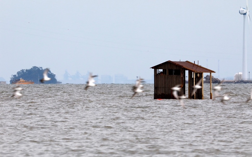 경기도 안산시 대부도 갯벌에 1평짜리 작은 판잣집이 들어섰다. 송성진(45) 작가의 작품 <1평조차>다. 송 작가는 지난 6월 방글라데시의 로힝야 난민촌을 방문한 기억을 바탕으로 집을 지었다. 지독한 폭염과 싸우며 완성한 집은 짓자마자 두 번이나 썰물에 휩쓸려 떠내려갔다. 송 작가는 그때마다 집을 되찾아 위태로운 나무 기둥에 매어두었다. 1평짜리 집은 그렇게 난민에 대한 물음의 표지로서 갯벌 위에 있다. 이 위태로운 집을 지키기 위해 송 작가는 날마다 몇 차례, 조수를 피해 들고 나며 철거된 집터에서 주워온 문을 갖다 붙이고 창문을 낸다. 네 가닥 밧줄에 의지해 간신히 머무르고 있는 무허가 무등기 판잣집은 겨우 두 달 존재를 허락받았을 뿐이다. <1평조차>는 자연재해가 없다면 9월8일까지 있게 된다.