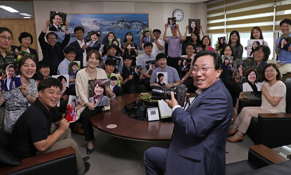 카메라를 든 민병희 강원도교육감(맨 앞 가운데)이 9월3일 강원도 교육청에서 자신이 찍어준 인물사진을 든 직원들과 함께 웃고 있다. 민 교육감은 너무 굳은 표정을 짓고 있는 직원들의 프로필 사진을 바꾸려고 직접 카메라를 잡았다. 2012년부터 직원들의 사진을 찍기 시작해, 3선에 성공한 올해까지 700여 명의 자연스러운 모습을 카메라에 담았다. 밝게 웃는 자신의 사진을 든 직원들의 모습을 다시 카메라에 담던 중 함께 포즈를 취했다.