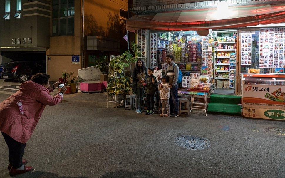 개미집처럼 이어진 서울 청파동 골목길에는 작은 사진들로 치장한 개미슈퍼가 있다. 사장 차효분(62)씨가 가게를 찾은 손님들과 찍은 사진을 바깥 벽에 붙여놓은 것이다. 개미슈퍼가 있는 청파로95길은 몇 해 전까지는 봉제공장 골목이었지만, 지금은 외국인 관광객이 찾는 숙박업소 밀집 지역으로 바뀌었다. 10년 전 가게를 인수한 차씨는 “국민학교 다닐 때도 동네 할머니가 이 가게를 하고 있었으니 적어도 60년은 넘었을 것”이라고 했다. 서울시 ‘오래가게’로 선정돼 구경꾼들의 발길이 이어지지만, 정작 음료나 과자는 옆 편의점을 이용한다며 차씨는 섭섭해한다. 차씨가 자신의 휴대전화로 인도 관광객의 가족사진을 찍어주고 있다.