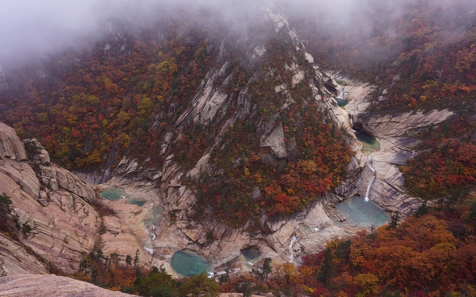 금강산이 가을 이름 ‘풍악산’에 걸맞은 오색 단풍옷을 입은 10월17일, 상팔담에 구름이 내려앉았다. 비가 온 뒤 구름에 가려 있던 연못 여덟 개가 살며시 모습을 드러내자, 마치 전설 속 팔선녀가 목욕을 마치고 하늘로 올라가는 듯, 그 옷자락이 보이는 것만 같다. 금강산의 주소인 강원도 고성군은 유일하게 남과 북에 함께 존재하는 ‘군’이다.
