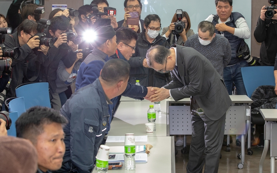 문무일 검찰총장이 11월27일 오후 서울 영등포구 여의도 이룸센터 교육실에서 부산 형제복지원 사건 피해자들에게 일일이 고개 숙여 사과하며 악수를 청하고 있다. 부산 형제복지원 사건은 1970~80년대 ‘도시 정화’를 이유로 불법적인 내무부 훈령에 따라 사람들을 강제수용하고, 구타와 감금, 학대, 성폭행, 강제 노역, 살인까지 저지른 최악의 인권유린 사건이다. 정부와 경찰, 검찰의 묵인 아래 3만여 명이 강제수용돼, 513명이 사망했다. 피해 생존자들이 복지원에 끌려가 겪은 일과 이 때문에 망가진 삶을 증언하는 동안, 문 총장은 눈물을 보이기도 했다.