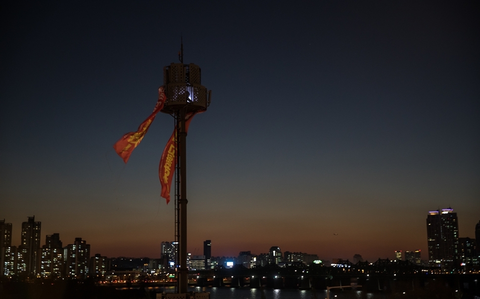 또 두 명의 비정규직 노동자가 하늘에 올랐다. ‘더불어사는 희망연대노동조합’ 엘지(LG)유플러스비정규직지부 김충태 수석부지부장과 고진복 서산지회 조직차장이 비정규직 철폐와 직접고용을 요구하며 12월12일 서울 한강대교 북단 40m 높이의 통신 철탑에 올라 농성을 시작했다. LG유플러스는 지난 9월 협력업체 노동자를 부분적으로 자회사에 편입하는 방안을 제시했다. 지부는 전원 직접고용을 요구하며 10월15일부터 본사 앞에서 노숙농성을 시작했으며, 11월29일부터 단식농성을 벌여왔다. 구멍이 숭숭 뚫린 반평도 안 되는 공간에 영하의 칼바람이 불고 있다.