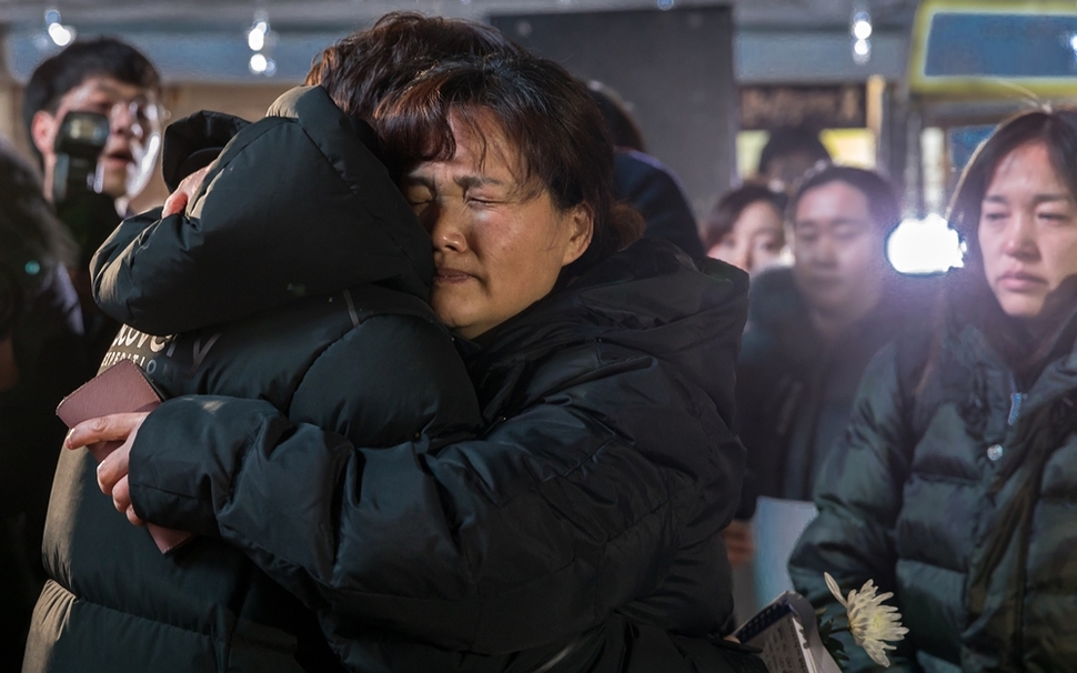 충남 태안화력발전소에서 12월11일 작업 중 숨진 비정규직 노동자 김용균(24)씨의 어머니 김미숙(앞줄 가운데)씨가 19일 저녁 서울 광화문광장에서 열린 촛불 추모제에서 아들과 같은 작업장에서 일하는 동료 노동자를 안아주었다. 김씨는 이 청년을 한동안 품에서 놓지 못한 채 울었다. 아들의 생전 모습을 얘기하는 청년을 마주한 김씨는 “아유, 예뻐라. 너라도 살아야 한다”며 안아주었고, 청년은 “죄송하다”는 말을 되풀이했다.