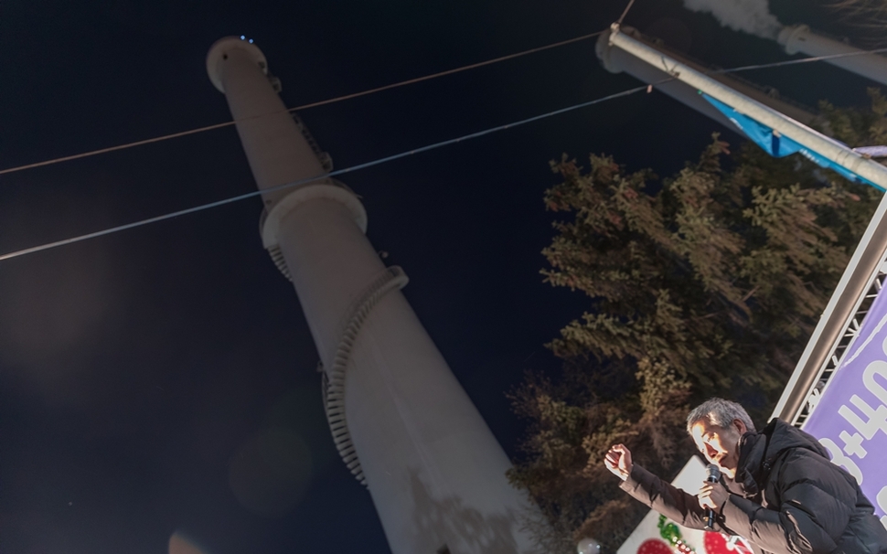 ‘하늘엔 영광, 땅엔 평화’를 노래하는 성탄 전야. 4년 전 굴뚝에 올라 408일을 싸웠던 차광호 금속노조 파인텍지회장이 굴뚝 아래서 ‘투쟁’을 외치고 있다. 굴뚝 위에서 빛나는 두 개의 파란 점은 파인텍 노동자 박준호·홍기탁씨다. 서울 목동 열병합발전소 굴뚝에서 이날로 408일째 고공농성 중이다. 한국합섬으로 입사한 파인텍 노동자들은 스타플렉스가 한국합섬을 인수해 만든 스타케미칼에서 일하다 스타플렉스가 스타케미칼을 청산하면서 일자리를 잃었다. 차씨는 이에 반발해 408일을 굴뚝 위에서 싸워 사 쪽과 단체협약 체결을 합의했지만, 약속은 지켜지지 않았다. 스타케미컬은 사명을 파인텍으로 바꾼 뒤 공장 문을 닫았고, 두 노동자는 2017년 11월12일 굴뚝에 올랐다. 차광호의 408일과 홍기탁·박준호의 408일. 그들의 하늘과 땅에는 영광도 평화도 없다.