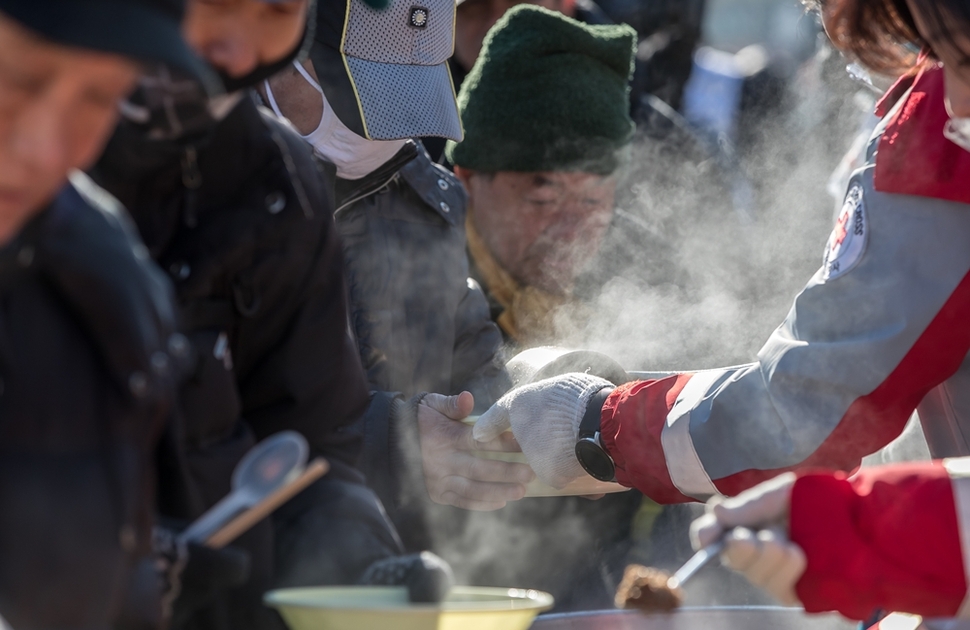 ‘떡국 한 그릇이면 한 살’이라고 한다. 시린 겨울, 끼니를 잇는 것조차 팍팍한 이들에게도 새해가 왔다. 2019년 둘째 날, 서울역광장에서 대한적십자사 봉사자들이 주변의 홀로 사는 노인과 노숙인 등에게 떡국을 나누고 있다. 차가운 도로 한켠에서 바람 맞아가며 한술 뜨지만, 제법 김을 뿜어내는 그 온기로 또 한 해 버텨내길 희망한다. 새해다!