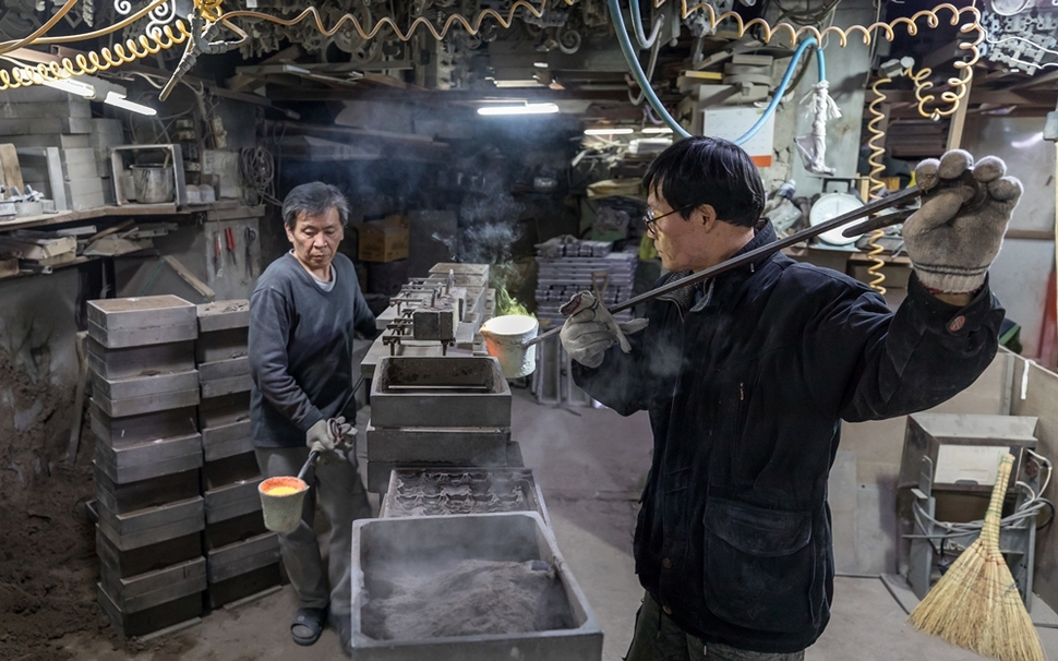 신아주물은 청계천 공구거리를 60년간 지켜왔다. 김학률(오른쪽)씨는 세 번째 사장으로 15년 동안 신아주물을 운영했다. “청계천은 하나의 유기체와 같아요. 서로 다른 업종들이 모여 제품을 완성하는 생태계를 이뤄, 하나가 무너지면 전부 말라 죽어요.” 김 사장이 주물틀에 쇳물을 붓는 중에도 공장 앞 골목에서는 철거반이 건너편 빈 가게의 자물쇠를 끊고 있었다. 이 지역 소상공인들은, 서울시가 세운재정비촉진지구를 해제하고 ‘제조산업문화특구’로 전환해 진정한 도시재생을 해주기를 요구하고 있다.