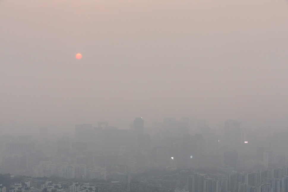 길가의 개나리가 꽃망울을 가득 머금었지만, 그 꽃을 터뜨리지도 못한 채 미세먼지에 봄을 빼앗겼다. 미세먼지 저감조치가 엿새째 발효된 3월6일 이른 아침, 서울 서대문구 안산에서 바라본 서울 도심은 잿빛이다. 미세먼지에 파묻힌 건물들이 마치 공동묘지에 촘촘히 늘어선 묘비처럼 보인다. 태양은 빛을 잃었고 전광판만 희미하게 번뜩인다. 기상관측 이래 최악의 미세먼지다. 정부가 여러 대책을 내놓고 있지만, 한동안 파란 하늘을 보기가 어려울 것이란 예보에 더 숨이 막힌다.