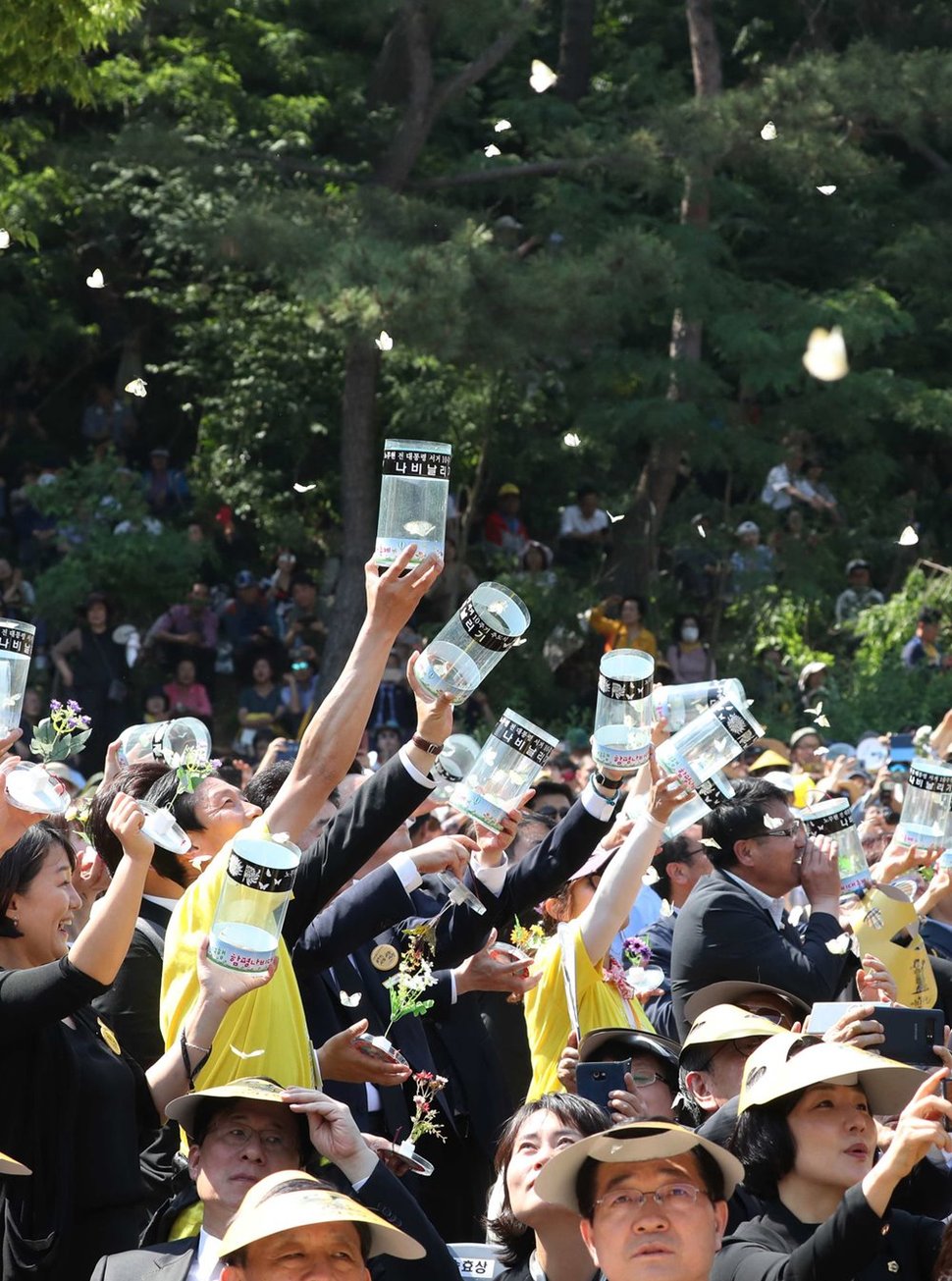 노무현 전 대통령의 10주기 추도식 중 추모객들이 전남 함평에서 가져온 나비 1004마리를 하늘로 날려보냈다. 공동취재사진