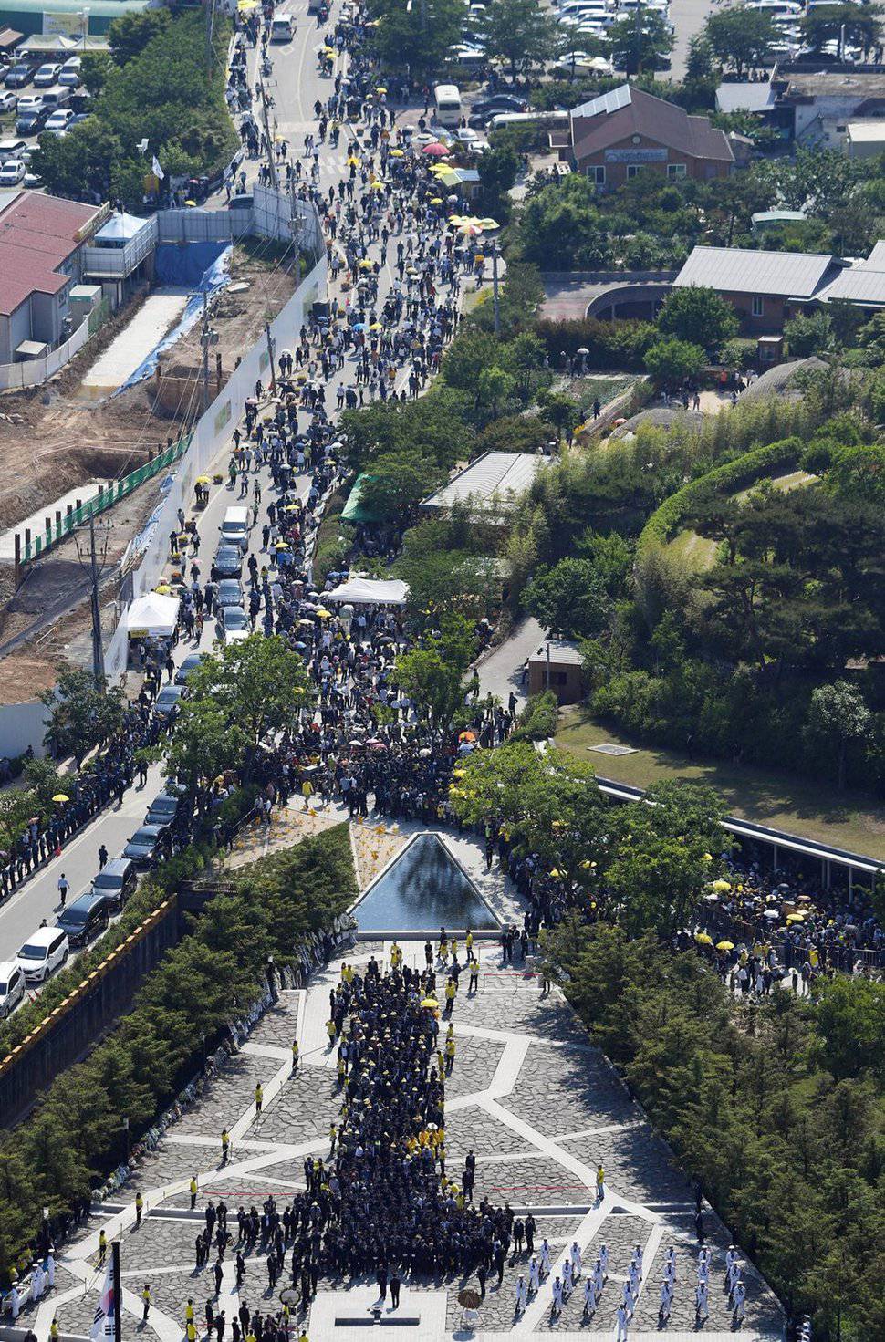 노무현 전 대통령 추도식에 참가한 추모객들이 노 전 대통령 묘소에 참배하려고 너럭바위부터 사저 앞 도로를 가득 메우고 있다. 공동취재사진