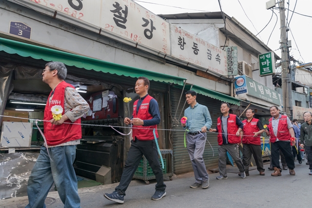 서울 을지로 공구상가 상인과 시민들이 6월3일 철거 위기에 놓인 세운3구역에서 서로를 연결하는 끈을 잡고 행진하고 있다. 이 지역은 세운재정비촉진지구로 지정돼 일부 구역은 이미 철거됐다. 행진에 앞서 이들은 기자회견을 열어 “서울시가 수십 년에 걸쳐 유기적으로 형성된 청계천·을지로 일대 도심 제조업 생태계의 가치를 모른다”며 철거 중단과 주상복합건물 건축 철회를 촉구했다.