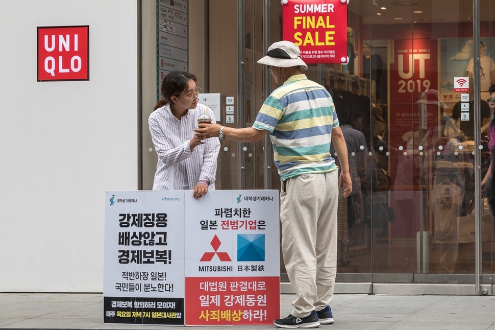 시민단체 ‘겨레하나’ 회원 김수정씨가 7월17일 서울 중구 명동의 일본 패션 브랜드 유니클로 매장 앞에서 일본의 ‘강제징용 배상’과 ‘경제보복 철회’를 촉구하던 중, 한 시민이 건네는 커피를 받고 있다. 김씨는 7월3일부터 매일 점심시간 이곳에서 1인시위를 하고 있다. 유니클로 일본 본사 페이스트리테일링은 최고재무책임자가 한국의 불매운동이 “장기적으로 매출에 영향을 줄 만큼 이어지지는 않을 것”이라고 말해 국내 여론이 악화되자, 16일 “부족한 표현으로 진심을 전달하지 못했다”며 사과했다.