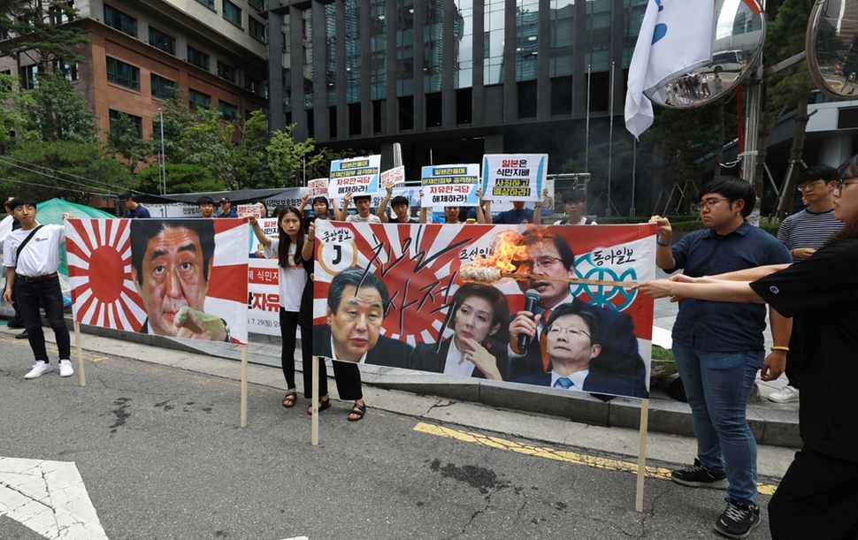 국민주권연대와 청년당, 한국대학생진보연합 소속 회원들이 7월29일 서울 종로구 율곡로 주한 일본대사관 앞에서 ‘일본의 식민지배 사죄와 배상’ ‘일본 편드는 자유한국당 해체’ 등을 촉구하고 있다. 이들은 이날부터 광복절인 8월15일까지를 ‘반일·반자유한국당 운동기간’으로 선포했다. 그리고 “<조선일보> <중앙일보> <동아일보> 등 보수언론이 식민 침탈 피해자에 대한 한국 법원의 정당한 판결을 무력화하려고 경제보복을 동원한 일본의 아베 신조 정부 비판보다 우리 정부 비난에 열을 올리고 있다”며 이 신문들의 로고가 새겨진 펼침막에 불을 붙였다.