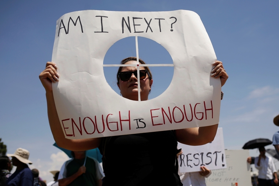 8월3일 총기 난사로 22명이 숨진 미국 텍사스주 엘패소에서, 한 여성이 7일 도널드 트럼프 미국 대통령의 현장 방문에 반대하며 사격 과녁 모양의 종이를 자신의 얼굴 높이로 들고 있다. 과녁엔 “다음은 나인가? 더 이상은 안 된다”고 적혀 있다. 멕시코와 국경을 맞대고 있어 히스패닉계 인구가 대다수를 차지하는 엘패소에서 발생한 총기 참사는 인종차별주의자의 증오범죄로 추정된다. 총을 난사한 뒤 경찰에 투항한 용의자는 20대 백인 청년으로, 범행에 앞서 ‘에이트챈’(8chan)이란 누리집에 ‘중남미계가 텍사스를 침공하고 있다’는 글을 올렸다. 엘패소 주민들은 트럼프 대통령의 반이민 정책과 인종차별적 발언이 증오범죄를 부추겼다며 분노한다. 한편 총기 참사가 벌어진 엘패소 월마트에선 사건 뒤에도 총기와 다양한 종류의 탄약을 계속 팔고 있다.