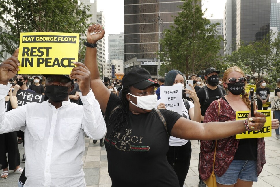 우리나라에 머무는 외국인과 시민들이 6월6일 서울 중구 삼각동 청계천한빛광장에서 미국 경찰의 폭압적 체포 과정에서 숨진 조지 플로이드를 추모하며 인종차별에 반대하는 침묵시위를 벌이고 있다. 일부 참가자는 시위 현장을 사회관계망서비스(SNS)로 중계하거나 공유했다. 아시아와 유럽 등 세계 전역에서 인종차별을 규탄하는 연대 시위가 열린 이날 오후, 서울 명동에 모인 참가자 150여 명은 청계천까지 평화행진을 했다.