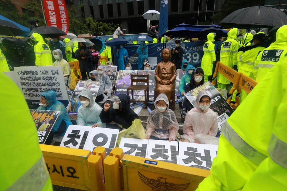 ‘반아베반일청년학생공동행동’ 소속 청년 20여 명이 6월24일 서울 종로구 옛 주한 일본대사관 앞에서 서로의 몸을 밧줄로 묶은 채 ‘평화의 소녀상’ 주변을 지키고 있다. 이들은 비를 맞으며 밤새워 소녀상을 지켜냈다. 왼쪽 뒤편에서 보수단체 회원들이 붉은 펼침막을 든 채 ‘정의기억연대’를 비난한다. 이날 보수단체가 소녀상 주변 집회 신고를 선점한 탓에 1992년부터 매주 수요일 소녀상 곁을 지켰던 정의기억연대는 10여m 떨어진 곳에서 집회를 진행했다. 경찰이 이들을 에워싸 물리적 충돌은 없었다.
