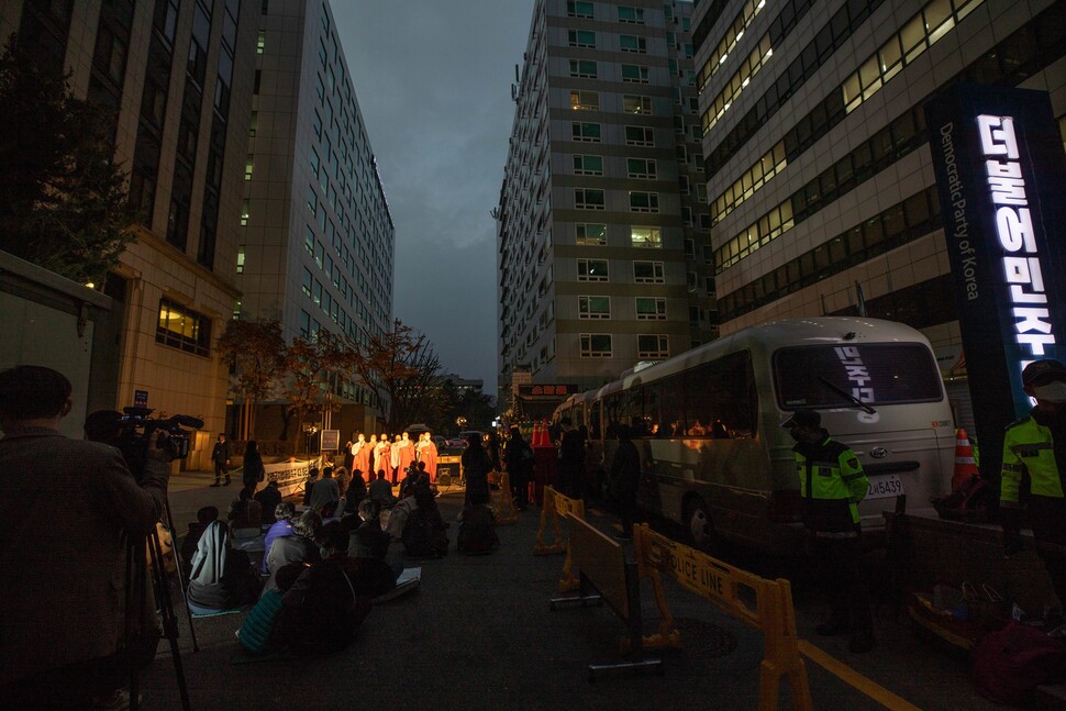 불교·원불교·개신교·가톨릭 성직자와 신자들이 11월17일 저녁 서울 여의도 더불어민주당사 앞에서 차별금지법 제정을 촉구하는 4대 종단 합동 기도회를 열고 있다. 장혜영 정의당 의원이 6월29일 대표 발의한 차별금지법은 국회 법제사법위원회에 상정됐다. 국가인권위원회도 6월30일 ‘평등 및 차별금지에 관한 법률’ 제정을 국회에 권고했다. 법 제정을 위한 ‘국회의 시간’이 흐르고 있지만, 의석수 절반을 훨씬 넘긴 174석의 더불어민주당은 개혁 법안 처리에 머뭇거리고 있다.