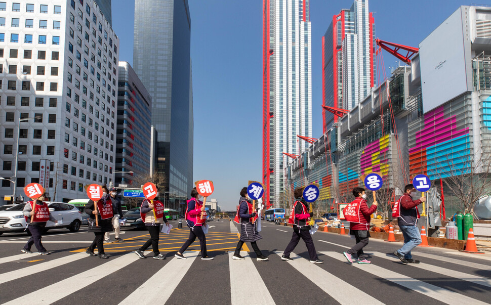 2020년 10월 노동조합을 만든 뒤 용역업체 교체를 구실로 2021년 첫날 해고된 엘지(LG)트윈타워 청소노동자들이, 3월8일 서울 여의도 일대에서 ‘고용승계 해고철회’란 글귀를 빗자루에 단 채 거리를 행진하고 있다. ‘세계 여성의 날’인 이날 83일째 파업을 이어간 이들은 70%가 여성인 청소노동자에게 “고용불안 위기를 함께 극복하자”는 내용의 편지를 보내 연대를 호소했다.