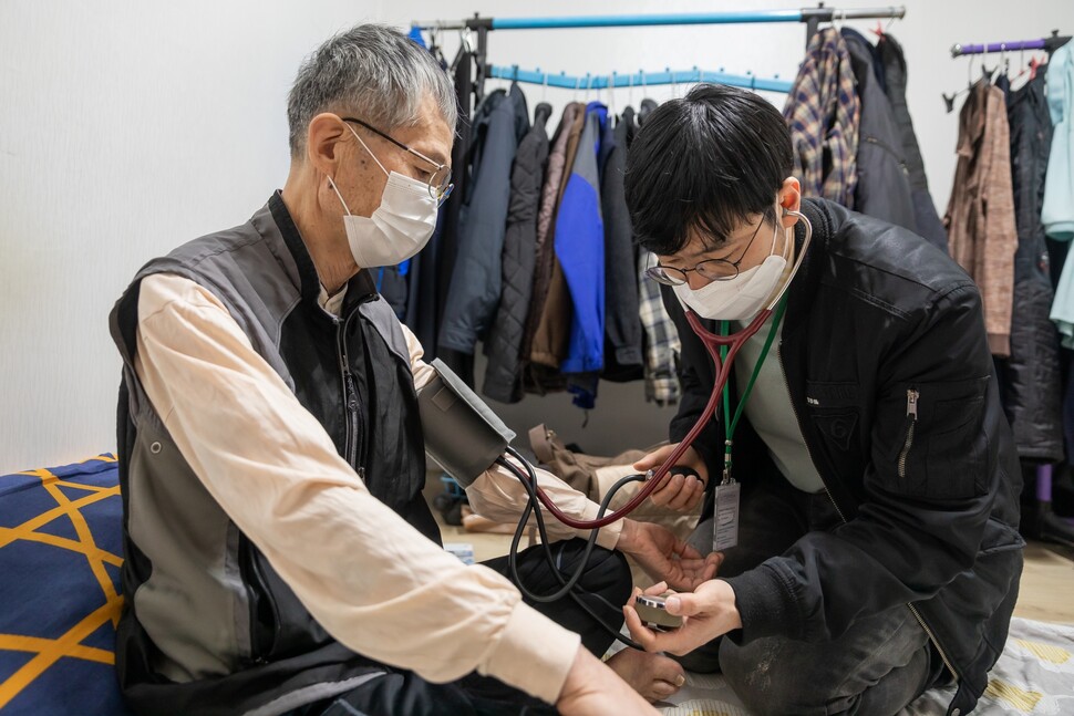 방문진료 전문 의료기관 ‘건강의집’ 대표원장 홍종원씨(오른쪽)가 3월6일 오전 서울 강북구 번동 다세대주택 반지하에 혼자 사는 어르신을 찾아 혈압을 재고 있다. 홍 원장은 폐질환을 앓는 이 어르신에게 수시로 전화해 상태를 점검하고 두 달에 한 번꼴로 방문진료를 한다. 진료하는 동안 집 안 이곳저곳을 둘러보며 살핀다. 이날 홍 원장은 이곳과 장애인 환자 두 집을 걸어서 방문했다.사진·글 박승화 기자 eyeshoot@hani.co.kr*건강의집 홍종원 대표원장 인터뷰http://h21.hani.co.kr/arti/society/society_general/50117.html