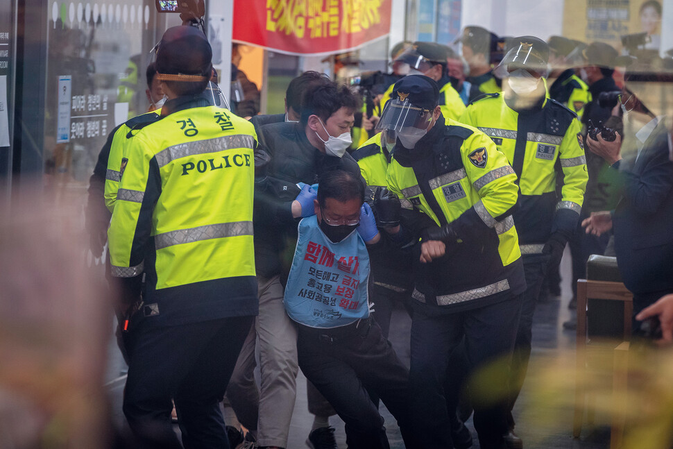 아시아나항공의 수하물 처리와 기내 청소를 맡는 하청업체 아시아나케이오 해고노동자 김정남씨(가운데 안경 쓴 이)가 4월14일 오전 단식농성을 벌이던 서울 중구 삼일대로 서울지방고용노동청 로비에서 경찰에 연행되고 있다. 2020년 5월 무급휴직에 동의하지 않는다는 이유로 해고된 아시아나케이오 노동자들은 중앙노동위원회에서 부당해고를 인정받았지만, 회사의 거부로 복직하지 못하고 있다. 이를 해결하려고 해고노동자들은 4월13일 정민오 서울지방고용노동청장을 면담했는데 명확한 답을 듣지 못하자 서울지방고용노동청 1층에서 단식농성에 들어갔다. 서울시는 김씨 등 농성자 네 명에게 네 차례 자진 퇴거를 요구한 뒤, 경찰력을 동원해 그들을 강제연행했다.