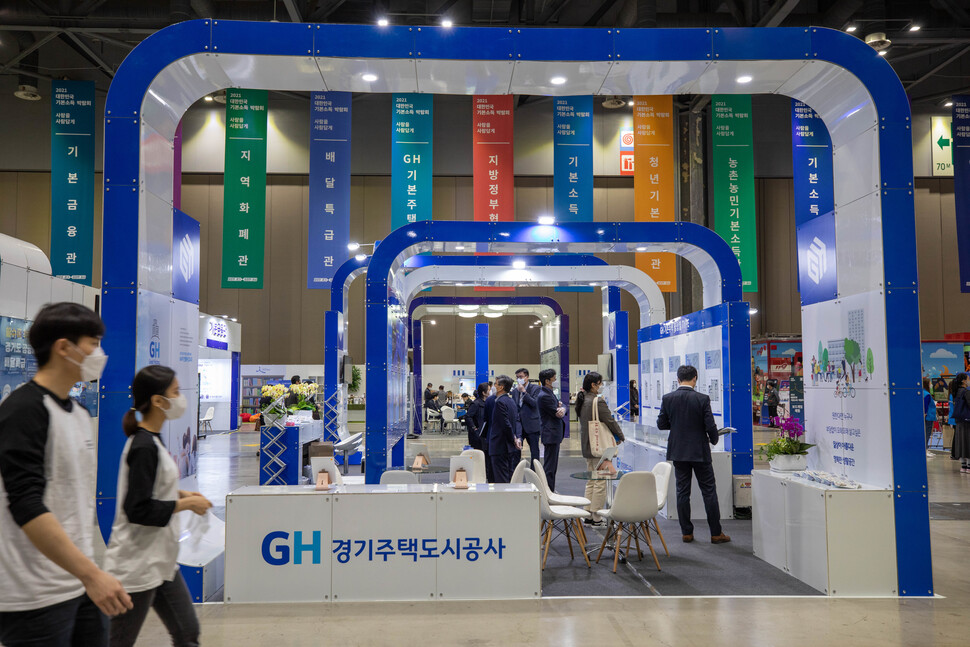 ‘2021 대한민국 기본소득 박람회’가 4월28일 경기도 고양시 킨텍스 제1전시장에서 열려 시민들이 기본소득에 대한 자료와 전시물을 둘러보고 있다. 이날 열린 개막식에 1천여 명이 화상으로 참가했다. 2019년 노벨경제학상 수상자 아브히지트 비나약 바네르지 미국 매사추세츠공과대학(MIT) 교수가 ‘코로나 팬데믹 시대, 기본소득의 확산’을 주제로 기조연설을 하는 등 기본소득 활동가와 전문가, 연구자들이 많이 참여했다. ‘사람을 사람답게’라는 슬로건을 내걸고 4월30일까지 열린 박람회는 공식 누리집과 유튜브 채널을 통해 실시간으로 중계됐다.