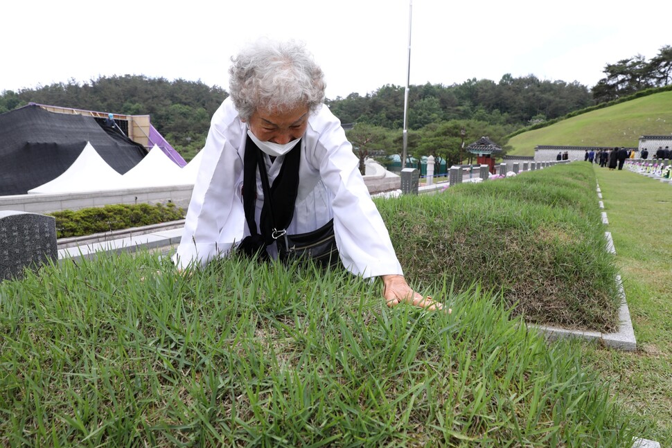 5·18민주화운동 41주년을 맞은 5월18일 광주 북구 국립5·18민주묘지에 묻힌 아들 김경철(당시 29살)씨 묘소를 찾은 임근단(91)씨가 봉분을 어루만지며 흐느끼고 있다. 청각장애인인 김씨는 1980년 5월18일 딸 백일잔치에 왔던 친구들에게 점심을 대접하려고 광주 시내에 나왔다가 충장파출소 앞에서 공수부대원들의 진압봉에 맞아 숨졌다. 임씨는 묘소에 머무르는 내내 아들의 이름을 애타게 불렀다.
