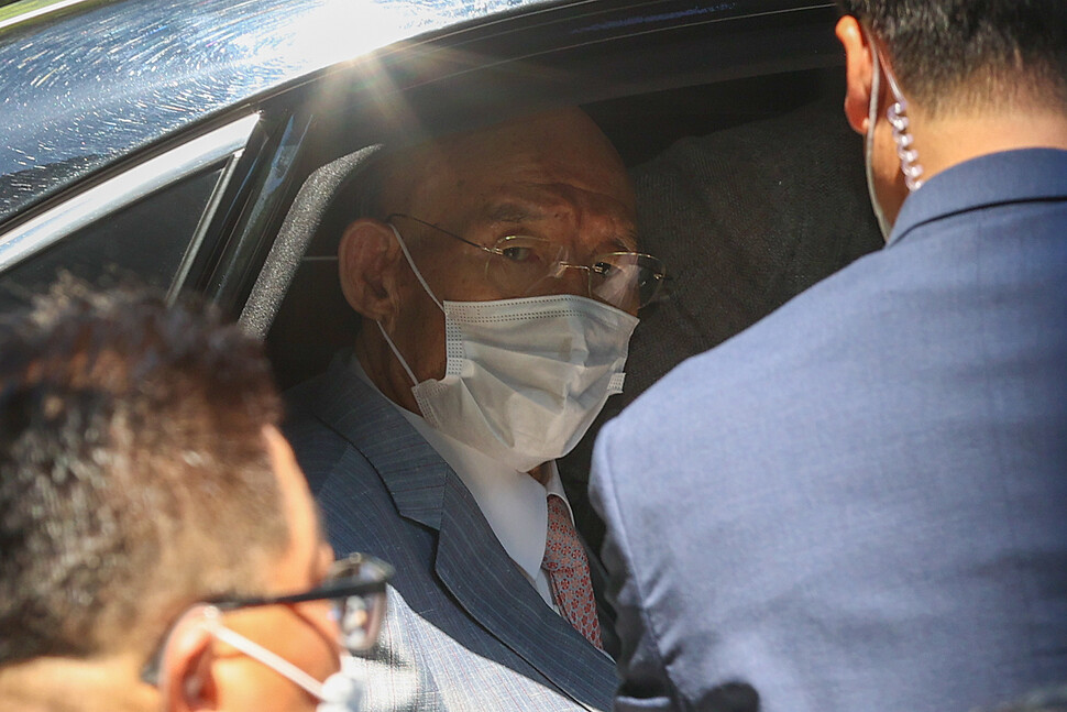 전두환(90)씨가 2021년 8월9일 사자 명예훼손 혐의로 항소심 재판이 열린 광주 동구 지산동 광주지방법원에 도착해 차에서 내리기에 앞서 취재진 쪽을 바라보고 있다. 5·18 광주 민주화운동 당시 계엄군의 헬기 사격을 증언한 고 조비오 신부를 “파렴치한 거짓말쟁이”라고 비난한 혐의 등으로 재판받는 전씨는 1심에서 징역 8개월에 집행유예 2년을 선고받았다. 이날 오전 취재진에 손을 흔들며 스스로 걸어 서울 연희동 자택을 출발한 전씨는 재판이 시작된 지 25분 만에 호흡곤란을 호소하면서 퇴정했다. 재판 말미에 다시 법정에 들어선 전씨는 경호원들의 부축을 받으며 법원을 떠났다.