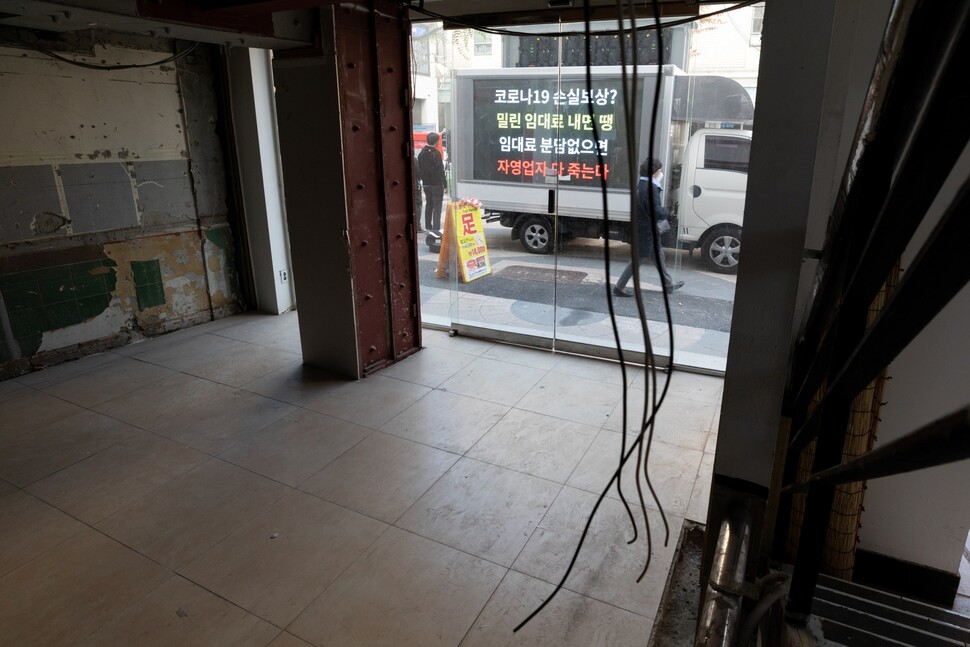 코로나19 방역 조치 때문에 피해를 입은 중소상공인에 대한 손실보상금 신청이 10월27일 시작됐다. 이날 서울 중구 명동 한복판의 한 1층 매장이 폐업한 뒤 새 임차인이 들어오지 않아 텅 비어 있다. 매장 앞 거리에서 참여연대 민생희망본부와 맘편히장사하고픈상인모임 등이 국민 세금을 재원으로 한 손실보상이 건물주에게 대부분 돌아가지 않도록 ‘정부-임대인-임차인의 임대료 분담’ 대책을 요구하는 기자회견을 하고 있다.