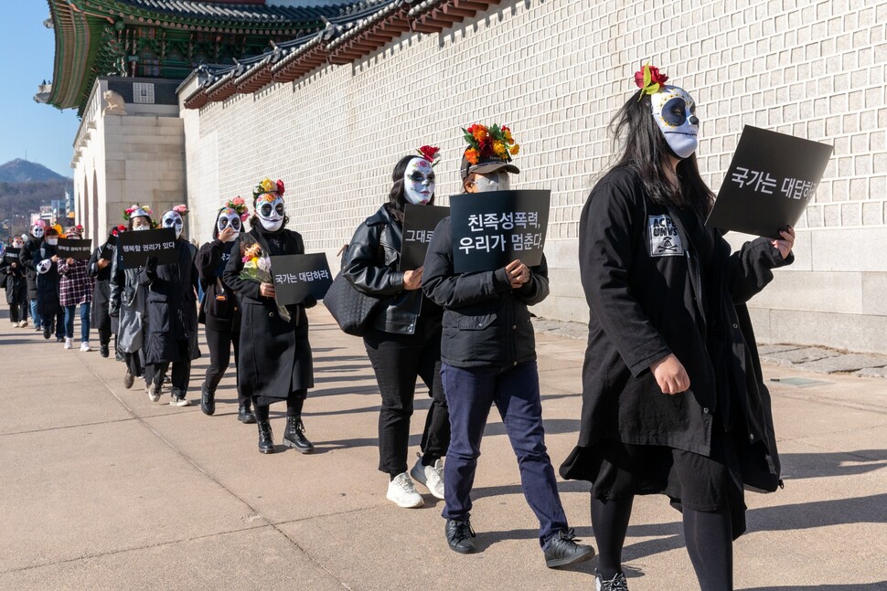 검은 옷차림에 꽃을 단 가면을 쓴 이들이 2021년 11월27일 서울 광화문 앞을 줄지어 걷고 있다. 친족에게 성폭력 피해를 당한 이들은 ‘정상가족 이데올로기에 깔려 죽음 같은 삶을 살았던 우리가 스스로의 힘으로 일어섰다’는 뜻을 모아 이날 세종문화회관 앞에서 ‘제1회 생존기념 축제’를 열었다. 그리고 광화문에서 종각까지 행진했다. 이들은 친족 성폭력 공소시효 10년이, 피해자가 피해를 인식하고 상담받아 법적 구제에 나서기엔 너무 짧다며 ‘공소시효 폐지’를 촉구했다.