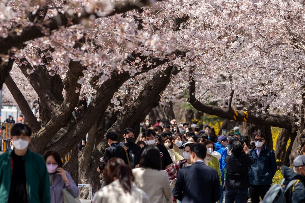 낮 최고기온이 16℃까지 오른 2022년 4월7일. 서울 여의도 윤중로를 찾은 시민들이 마스크를 쓴 채 활짝 핀 벚꽃의 정취를 즐기고 있다. 코로나19 확산에 따른 거리두기로 벚꽃철에 봉쇄됐던 윤중로는 3년 만에 시민을 맞았다. 개화 시기에 맞추느라 벚꽃길 개방도 미뤄져, 4월8일 정오부터 18일 정오까지 차량 출입이 통제된다.