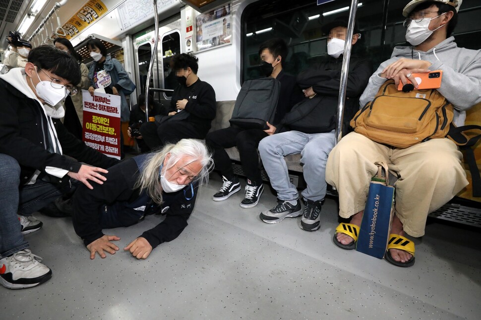 박경석 전국장애인차별철폐연대(전장연) 상임공동대표가 2022년 4월21일 아침 8시께 서울 지하철 3호선 경복궁역에서 열차에 올라 바닥을 기며 출근길 탑승시위를 벌이고 있다. 3월30일 장애인 권리예산 등에 대한 대통령직인수위원회의 답변을 기다리겠다며 시위를 중단한 지 22일 만이다. 인수위의 공식적인 답이 없자, 전장연은 3호선 경복궁역과 2호선 시청역에서 탑승시위를 재개했다. 전장연은 “추경호 경제부총리 후보자가 장애인 권리예산에 대한 입장 발표를 약속한다면 ‘출근길 지하철 탑니다’ 시위를 멈추겠다”고 밝혔다.