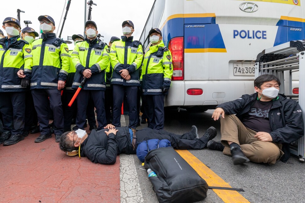 ‘비정규직이제그만 공동투쟁’ 소속 노동자들이 2022년 4월29일 ‘비정규직 고용불안 해소와 안전하게 일할 권리’가 담긴 요구안을 서울 종로구 통의동 대통령직인수위원회에 전달하려다 경찰에 가로막히자 거리에 누워 농성을 벌이고 있다. 이들은 앞서 청계천 전태일다리에서 약식집회를 한 뒤 종로와 세종대로를 거쳐 인수위 앞까지 행진했다. 인수위 앞 사직로에서 밤샘 노숙농성을 한 뒤 이튿날 다시 요구안 전달을 시도했다. 이마저 막히자 요구안을 찢어 던지는 퍼포먼스로 1박2일 투쟁대회를 마무리했다.