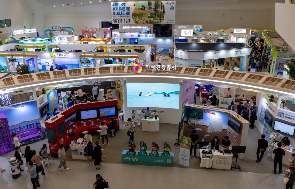 본격적인 피서철을 앞두고 ‘#떠나라! #자유롭게! #내나라로!’란 해시태그를 내건 대규모 여행박람회가 열렸다. 2022년 6월16일 서울 중구 을지로 동대문디자인플라자(DDP)에서 열린 ‘내 나라 여행박람회’를 찾은 시민들이 도별로 마련된 여행 명소 부스를 돌아보고 있다. 문화체육관광부와 한국관광협회중앙회가 함께 연 박람회에선 코로나19로 큰 어려움을 겪는 여행업계의 빠른 회복을 도우려고 여행사와 관광벤처, 호텔 등 50개사가 다양한 국내 여행상품을 파는 ‘여행상품관’도 마련됐다. 19회를 맞은 여행박람회는 이날부터 19일까지 나흘간 열린다.