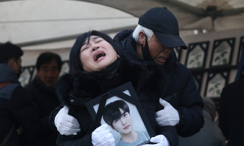이태원 참사 희생자인 배우 이지한씨의 어머니 조미은씨가 2022년 12월14일 서울 용산구 녹사평역 이태원광장에 설치된 ‘10·29 이태원 참사 희생자 합동분향소’에서 아들의 영정을 품에 안은 채 통곡하고 있다. 이씨의 아버지 이종철 유가족협의회 대표(오른쪽)가 울면서 조씨를 부축하고 있다. 서울의 체감온도가 영하 10도 아래까지 떨어진 이날 참사 46일 만에 설치된 합동분향소에는 희생자 76명의 영정이 제단에 올려졌다. 사진 공개를 원치 않는 다른 희생자들은 국화가 그려진 액자를 올렸다. 이 분향소는 유가족협의회와 시민대책회의가 마련했다.