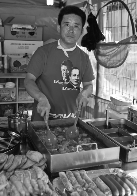 가만히 서 있기만 해도 땀이 흐르는 한여름, 비닐로 지붕을 엮은 1평 남짓한 공간의 불 옆에서 튀기고 쪄내는 일을 하다 보면 어느새 몸은 땀으로 젖는다. 목에 감은 수건으로 땀을 닦아내며 버텨보지만, 손님이 뜸한 시간엔 그도 어쩔 수 없이 의자에 앉아 잠깐이라도 불을 피하고 냉수를 마시면서 몸을 식힌다.