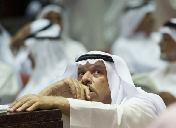 지난 10월13일 쿠웨이트의 한 증권회사 객장에서 아랍 전통 복장을 한 투자자가 바닥을 모르고 추락하는 주식시세표를 뚫어져라 쳐다보고 있다.