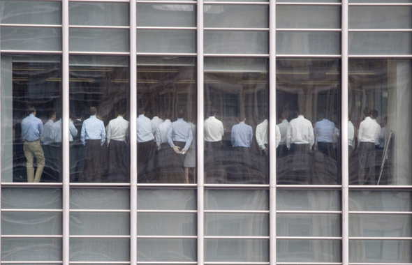 ‘잔치는 끝났다.’ 세계적인 투자은행으로 꼽혀온 리먼브러더스의 주식이 40%나 폭락한 다음날인 지난 9월11일 영국 런던의 이 회사 건물에서 직원들이 선 채로 긴급 회의를 하고 있다. 리먼브러더스는 나흘 뒤인 9월15일 파산했다.