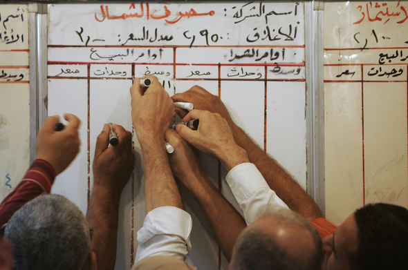 전쟁의 땅에서도 주식은 거래된다. 이라크 수도 바그다드 주식시장에서 직원들이 칠판에 주가를 기록하느라 분주하다.
