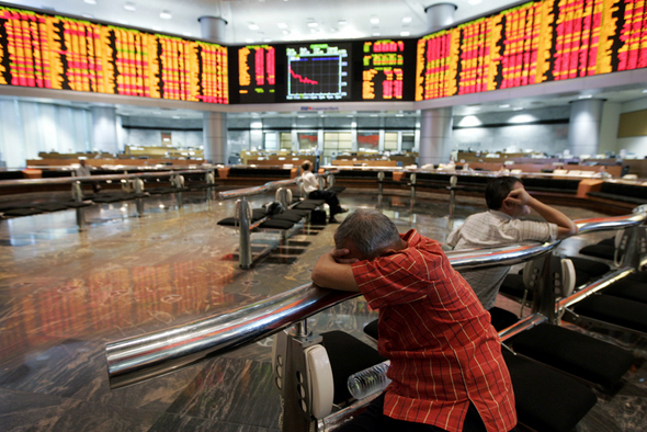 지난 10월10일 말레이시아 쿠알라룸푸르의 텅빈 증권회사 객장에서 주식 투자자로 보이는 한 남성이 팔로 얼굴을 휘감은 채 앉아 있다. 이날도 말레이시아 주식 시장은 폭락세를 이어갔다.