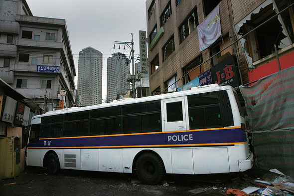 서울 용산구 한강로 3가 63-70번지. 경찰차가 가림막을 대신하고 있다. 이곳에서 철거민 5명이 불에 타 숨졌다. 이제 가림막은 죽음도 은폐한다.
