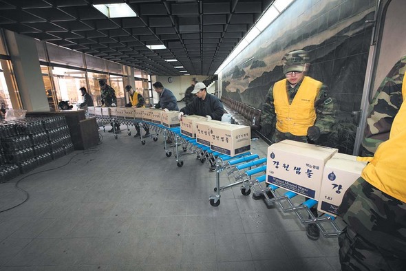 다른 시·도와 사회단체 등에서 보낸 생수를 태백KBS 강단에 보관하고 있다. 지난 2월11일 오전 관내 어린이집으로 보내기 위해 군장병과 아르바이트 학생들이 생수 상자를 트럭에 싣고 있다.