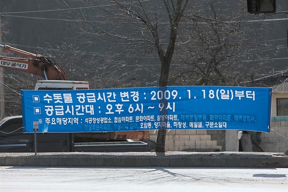 수돗물 공급 시간을 알리는 펼침막은 태백 시내 곳곳에서 볼 수 있다. 물을 오전에 공급하는 동네가 있고, 오후에 공급하는 동네가 있다.