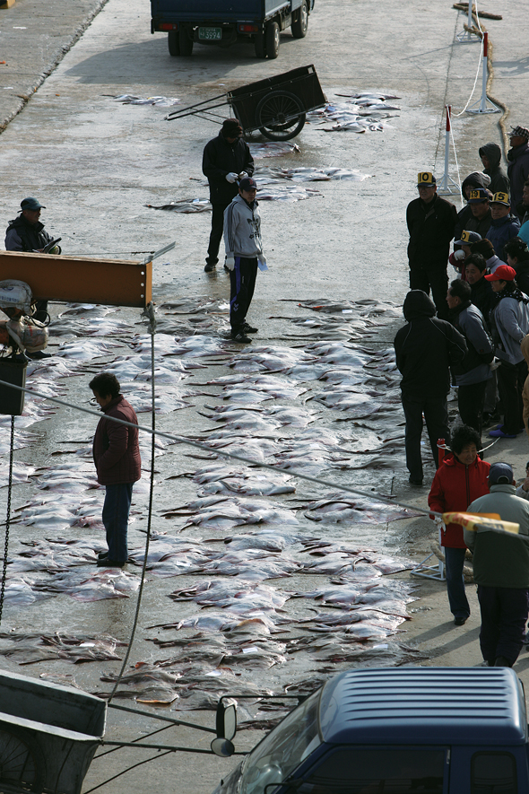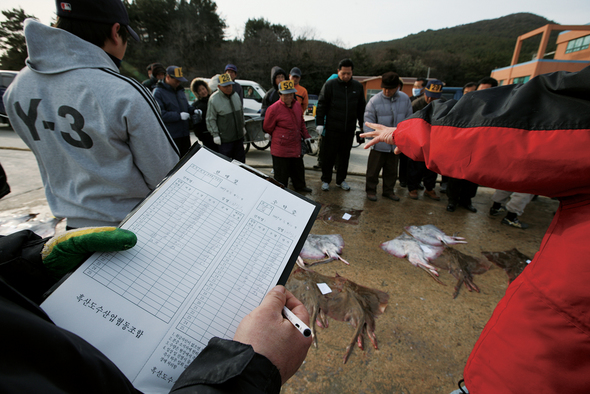 경매에 부쳐질 끈적끈적한 홍어들은 전자저울에서 무게를 잰 뒤 1번(8kg 이상), 2번(7~8kg), 3번(6~7kg), 4번(5~6kg) 등으로 분류된다.