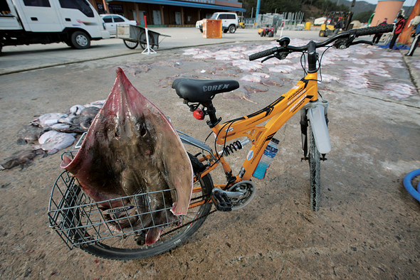 홍어 손질하는 데 2만여원, 택시비 1만5천원, 수수료 4만여원 등이 붙게 돼 실제 소비자가격은 경매가에 비해 7만5천원가량 비싸진다. 한 상인이 중매인에게서 구입한 홍어를 자전거 바구니에 넣었다.