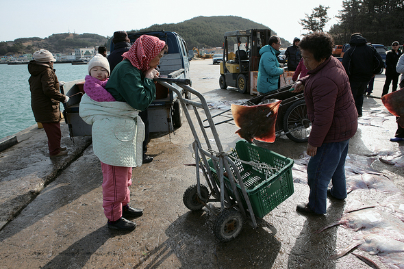 홍어잡이배 선주와 선원들의 표정이 썩 좋지 않다. 요즘 홍어가 많이 잡히지만 그만큼 값이 떨어져 예전의 반값에 경매되고 있기 때문이다.