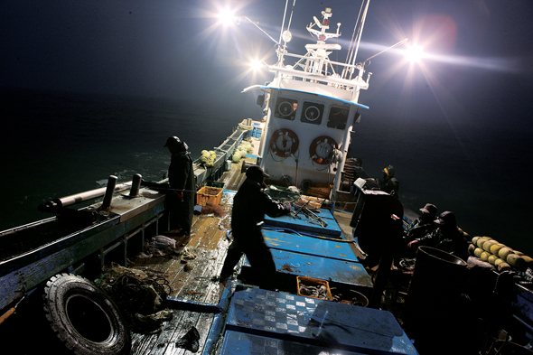 3월17일 새벽 2시, 흑산도에서 배로 4시간 거리인 홍도 인근 해상. 선원들의 작업은 숨가쁠 정도였다. 바구니당 400개나 되는 주낙이 놀랄 만큼 빠른 속도로 풀어진다. 조금이라도 방심을 했다간 대형사고가 날 것 같다. 투망이 끝난 뒤 이어지는 양망 작업. 펄떡거리는 홍어가 줄줄이 올라왔다. 수확의 기쁨에 피로가 날아간다. 4월부터는 홍어 금어기. 그래서 손길이 더욱 바쁘다.
