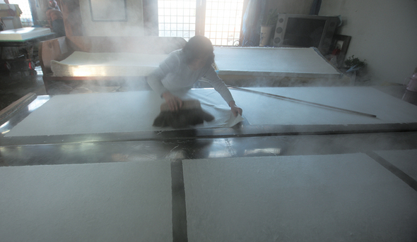 물기를 제거한 한지를 건조대로 옮겨 말리고 있다.