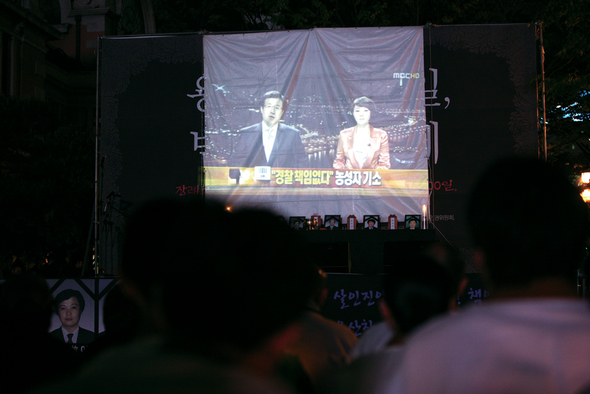 용산 참사 100일을 기록한 영상을 서울역 광장에서 추모 인파와 유족들이 보고 있다.