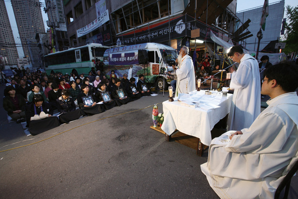 지난 4월29일 저녁 서울역 광장에서 용산 참사 100일 추모집회에 참석한 유족들.